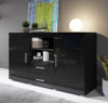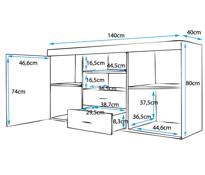 Aparador de linea moderna ideal para un salón de diseño moderno. Aparador de 2 puertas y 2 cajones que serán muy útiles para guardar todos tus objetos voluminosos y recuperar espacio en tu comedor. El interior se compone de 2 estantes ajustables. Materiales:Estructura melamina en brillo Puertas melamina en brillo.Tiradores de aluminio. Interior:Dos cajones, estantes abiertos y dos armarios con estantes internos. Medidas: Ancho 140 cm.Alto 80 cm.Profundo 40 cm. Ver en la imagen.Instrucciones para un fácil montaje..