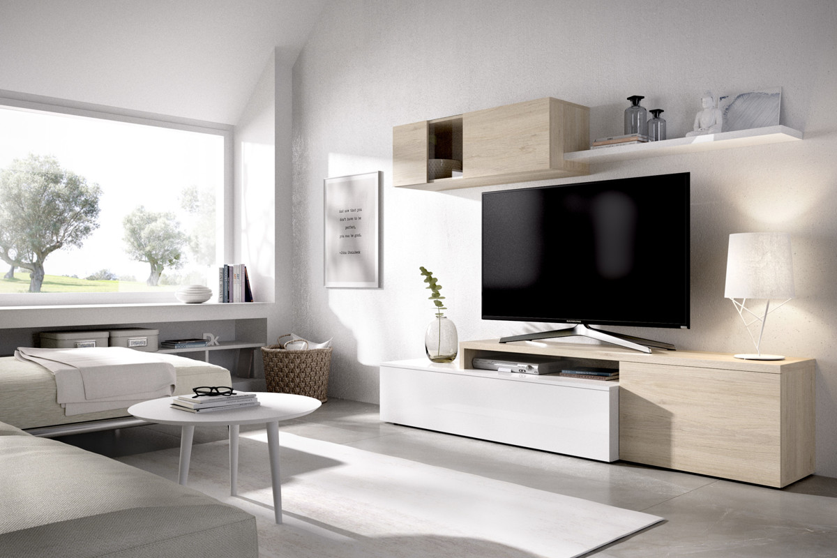 Componentes - Compás de gas elevable para la puerta del módulo mural. - Bisagra metálica para la puerta del módulo inferior. - Compás de retención metálico para la puerta abatible del módulo inferior. - Apertura de puertas mediante el sistema Push. - Tacos ABS quitarruidos y antirrayaduras en las piezas con contacto directo con el suelo. Observaciones - Mueble Tv con soporte de hasta 60kg. - Módulo superior con soporte de hasta 12kg. - Estante mural con soporte de hasta 10kg. - Se incluye los dispositivos de fijación del mueble a la pared. Utilizar los herrajes más adecuados según el tipo de ésta. - Montaje reversible y en L, es decir, permite 4 disposiciones distintas detalladas en las instrucciones de montaje paso a paso para un montaje fácil. - Estructura muy sólida y consistente que da garantía de un mueble duradero y resistente